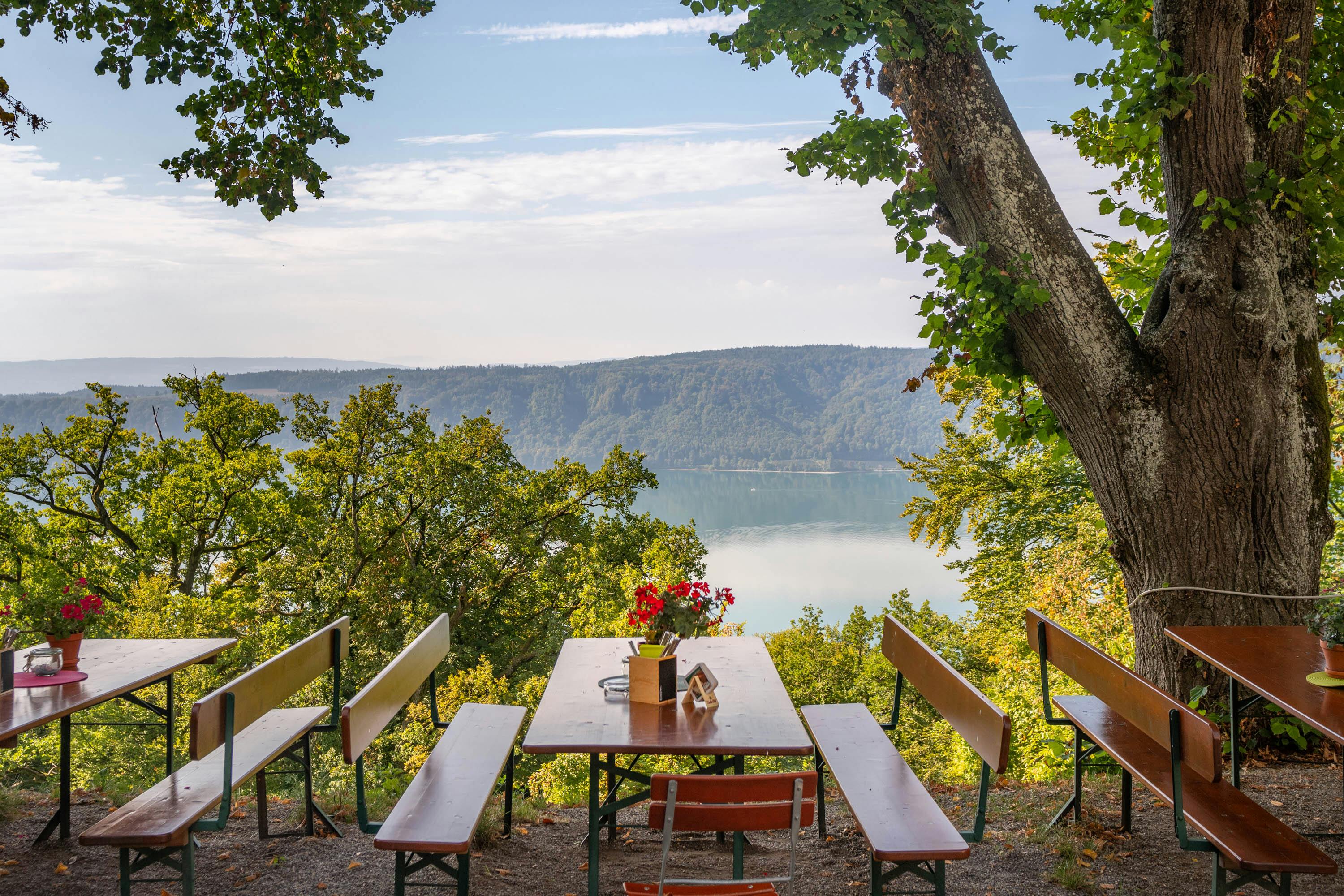 Am Haldenhof lässt sich nach einer Wanderung auf der großen Aussichtsterrasse entspannt ein Kaffee mit Kuchen oder eine deftige Mahlzeit genießen. Das Höhengasthaus kann zudem gut mit dem Auto erreicht werden.