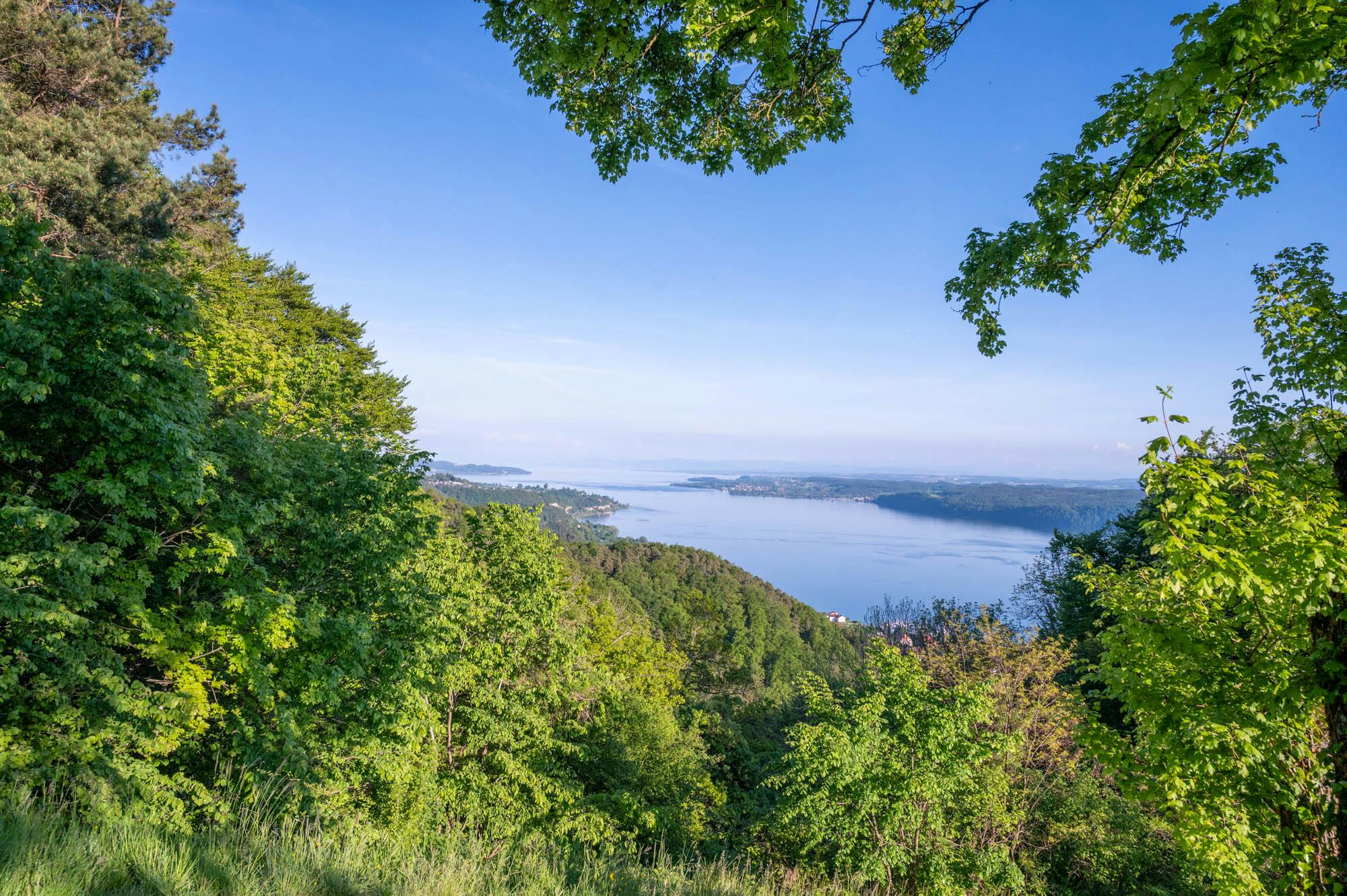 Der Blick geht über den östlichen Teil des Überlinger Sees, über den Obersee in Richtung Bregenz. Im Vordergrund ist die idyllisch in die Steilhänge eingebettete Gemeinde Sipplingen zu sehen. Bei guter Sicht und Fönwetterlage bietet sich hier ein grandioses Alpenpanorama. Darunter ist das Albsteinmassiv mit dem Säntis (2501,9m) zu sehen.